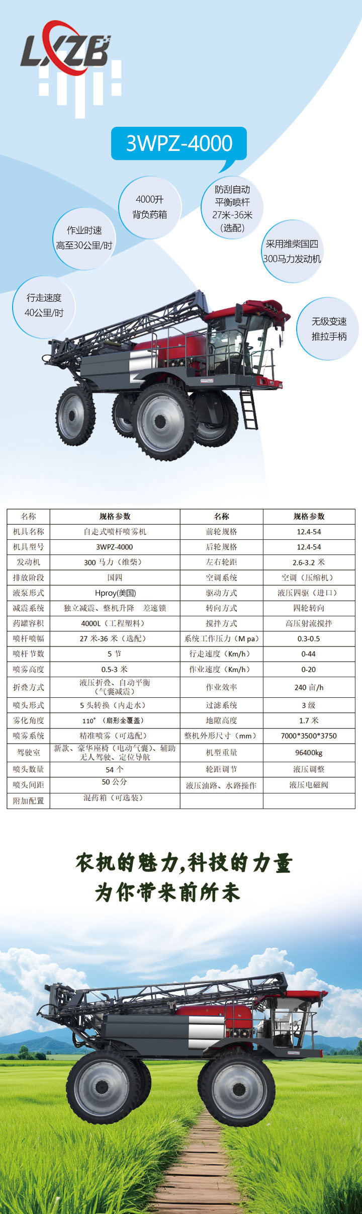 3WPZ-4000?噴藥切頂及一體的全液壓噴桿噴霧機(jī)。這款機(jī)器行走速度可達(dá)40公里每小時(shí)。作業(yè)時(shí)速可高達(dá)30公里每小時(shí)3WPZ-4000這款車搭配4000升背負(fù)式藥箱;30米防刮氣囊減震噴桿,搭配5頭轉(zhuǎn)換進(jìn)口噴頭。此機(jī)型采用濰柴國(guó)四排放標(biāo)準(zhǔn)300馬力發(fā)動(dòng)機(jī),ACE?757升流量進(jìn)口泵,輪邊液壓驅(qū)動(dòng),進(jìn)口液系統(tǒng)由PMP公司配套以及售后。