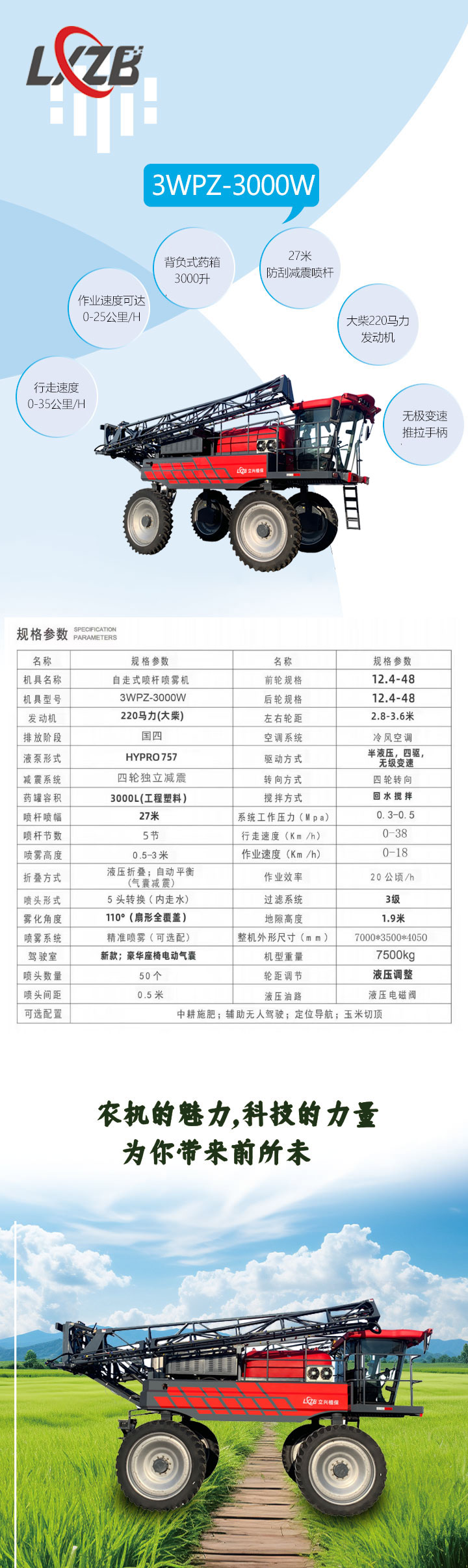 3WPZ-3000W噴藥切頂及一體的噴桿噴霧機行走速度可以達(dá)到0-35公里/H。作業(yè)速度根據(jù)作業(yè)條件可達(dá)0-25公里/H3WPZ-3000W搭配3000升的背負(fù)式藥箱;27米防刮減震噴桿,配備自動平衡功能。五頭轉(zhuǎn)換美國噴頭。此機型采用錫柴國四排放標(biāo)準(zhǔn)220馬力發(fā)動機。噴藥水泵采用美國HYPRO品牌大流量離心泵(757L/MIN)。機械液壓相結(jié)合的傳動方式是立興打藥機的獨有技術(shù),已經(jīng)在10余種機型,2000多臺機器上配套使用,技術(shù)成熟可靠。原理(伊頓液壓大崩傳動液壓馬達(dá),液壓馬達(dá)傳動變速箱;利用變速箱換檔提升扭矩。這套驅(qū)動技術(shù)大幅度提升了該車型的防陷能力搭配四輪獨立懸掛,減震效果優(yōu) 秀,在坑洼地塊駕駛感舒適。經(jīng)過長時間高負(fù)荷泥濘地面測試。整體通過性及強。無極變速推拉手柄操作行走非常簡單,整車全部功能都可以在扶手箱電控按鍵上進(jìn)行操作。新款豪華駕駛室,氣動懸浮座椅。進(jìn)口智能噴霧系統(tǒng)、噴霧系統(tǒng)外走水單體110°全覆蓋噴灑,回水?dāng)嚢瑁夁^濾,液壓操作,可加裝精準(zhǔn)噴霧,實現(xiàn)精準(zhǔn)噴灑不浪費藥液,達(dá)到高 效使用效果,提高了該機型操作 安 全 性,使用可靠性,維護(hù)便捷性及舒適性。