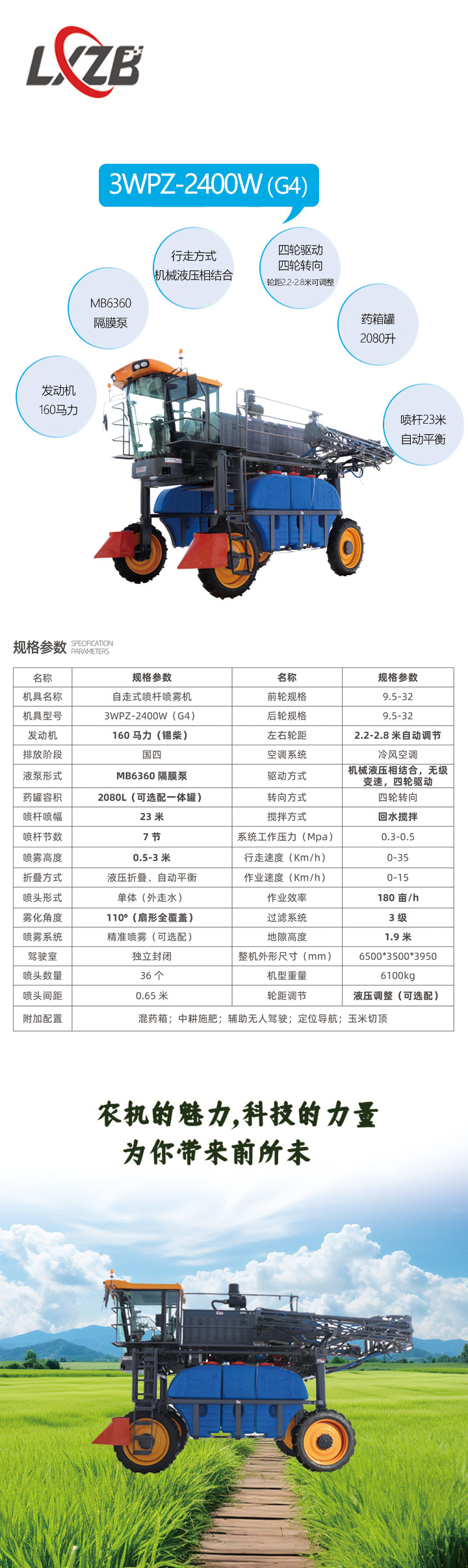 3WPZ-2400W(G4)自走式噴桿噴零機是一種集噴藥,切頂,施肥等功能于一體的噴藥設(shè)備此機型采用錫柴國四排放標準160馬力發(fā)動機,MB6360隔膜泵,配備全封閉獨立駕駛室,該機型行走方式采用機械液壓相結(jié)合的傳動方式。機械液壓相結(jié)合的傳動方式是立興打藥機的獨有技術(shù),已經(jīng)在10余種機型,2000多臺機器上配套使用,技術(shù)成熟可靠。