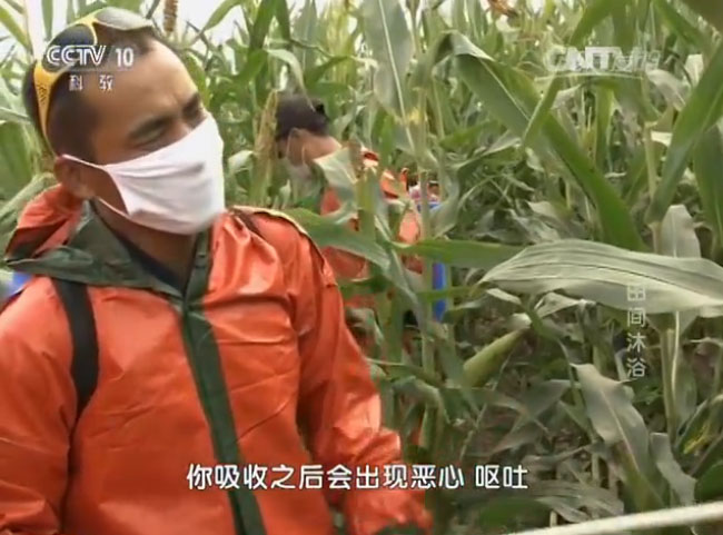 給高桿作物噴藥可不是一件輕松的工作,就拿玉米來說,田里作物生長得十分茂盛,幾乎密不透風(fēng),頂著烈日在這里工作非常難受,而且在下到田地里之前,記者還被要求穿上厚厚的防護服,因為噴灑的農(nóng)藥含有劇毒,只有這樣,才能進入高桿作物的所在地進行采訪。